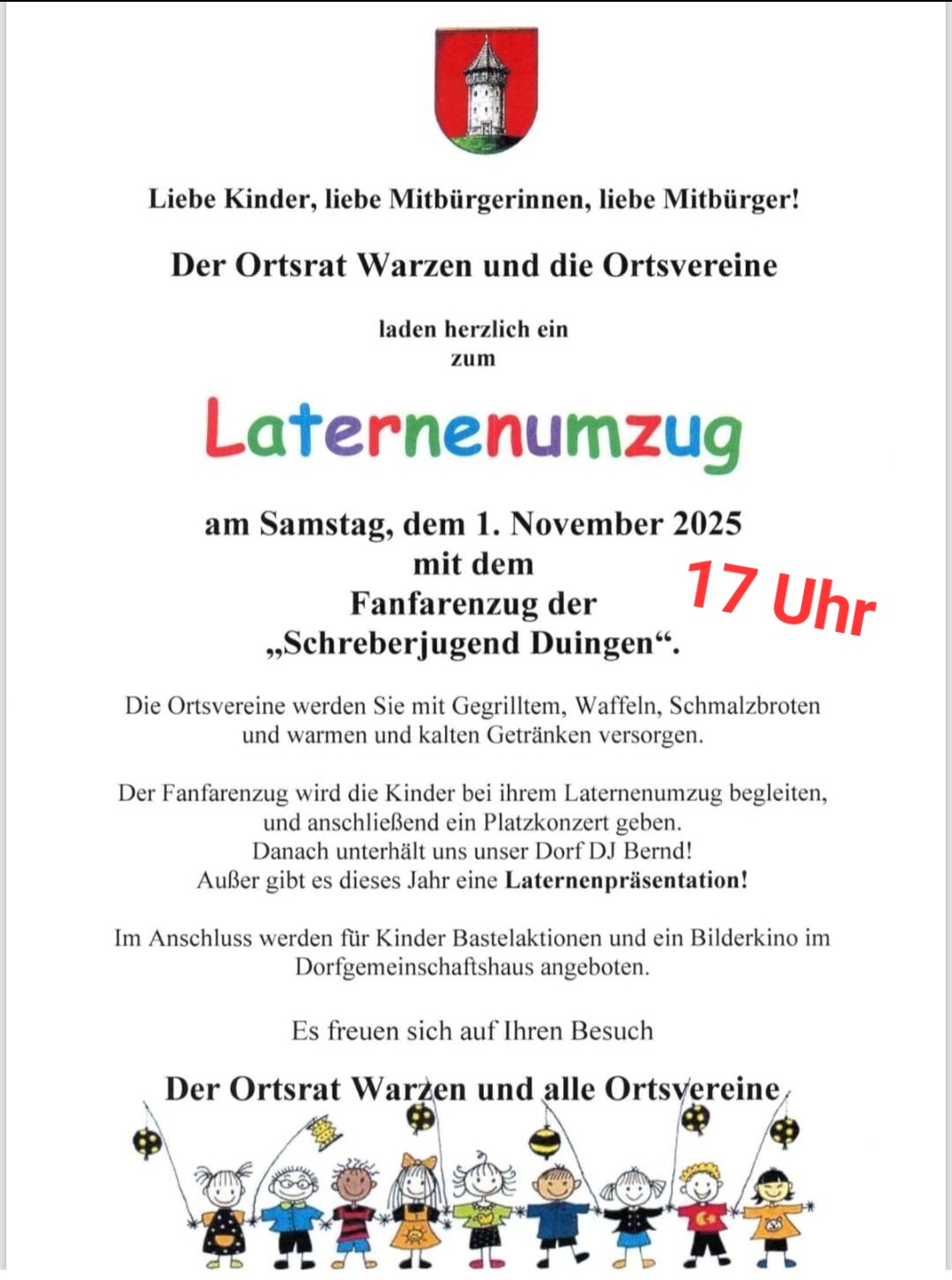 Am Samstag, den 1. November 2025, lädt der Ortsrat Warzen gemeinsam mit den Ortsvereinen herzlich zum traditionellen Laternenumzug ein. Ab 17:00 Uhr verwandelt sich unser Ort in ein buntes Lichtermeer – ein stimmungsvolles Erlebnis für Groß und Klein!