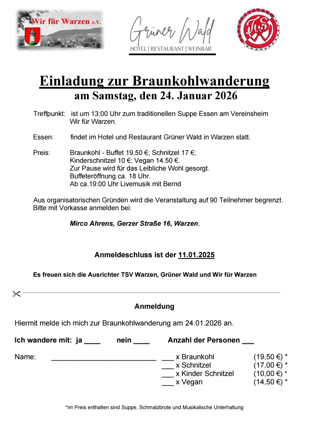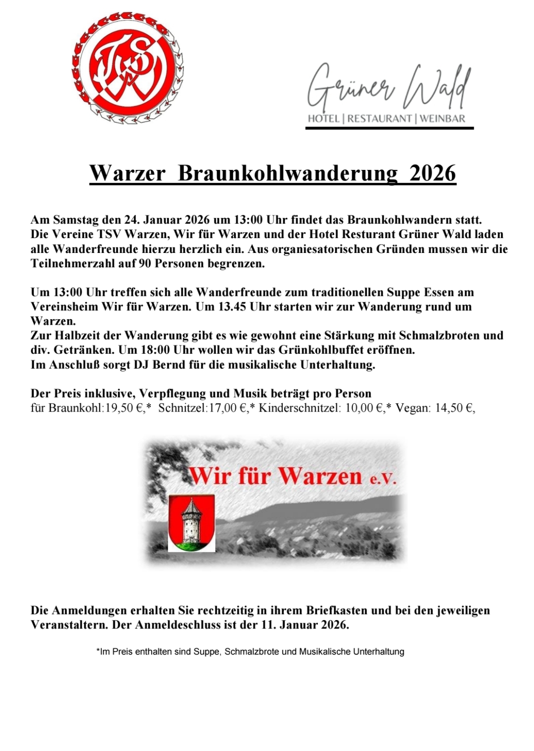Die Vereine TSV Warzen, Wir für Warzen e.V. und das Hotel Restaurant Grüner Wald freuen sich, euch zu einem unvergesslichen Tag begrüßen zu dürfen. Aus organisatorischen Gründen ist die Teilnehmerzahl auf 90 Personen begrenzt – also schnell anmelden!