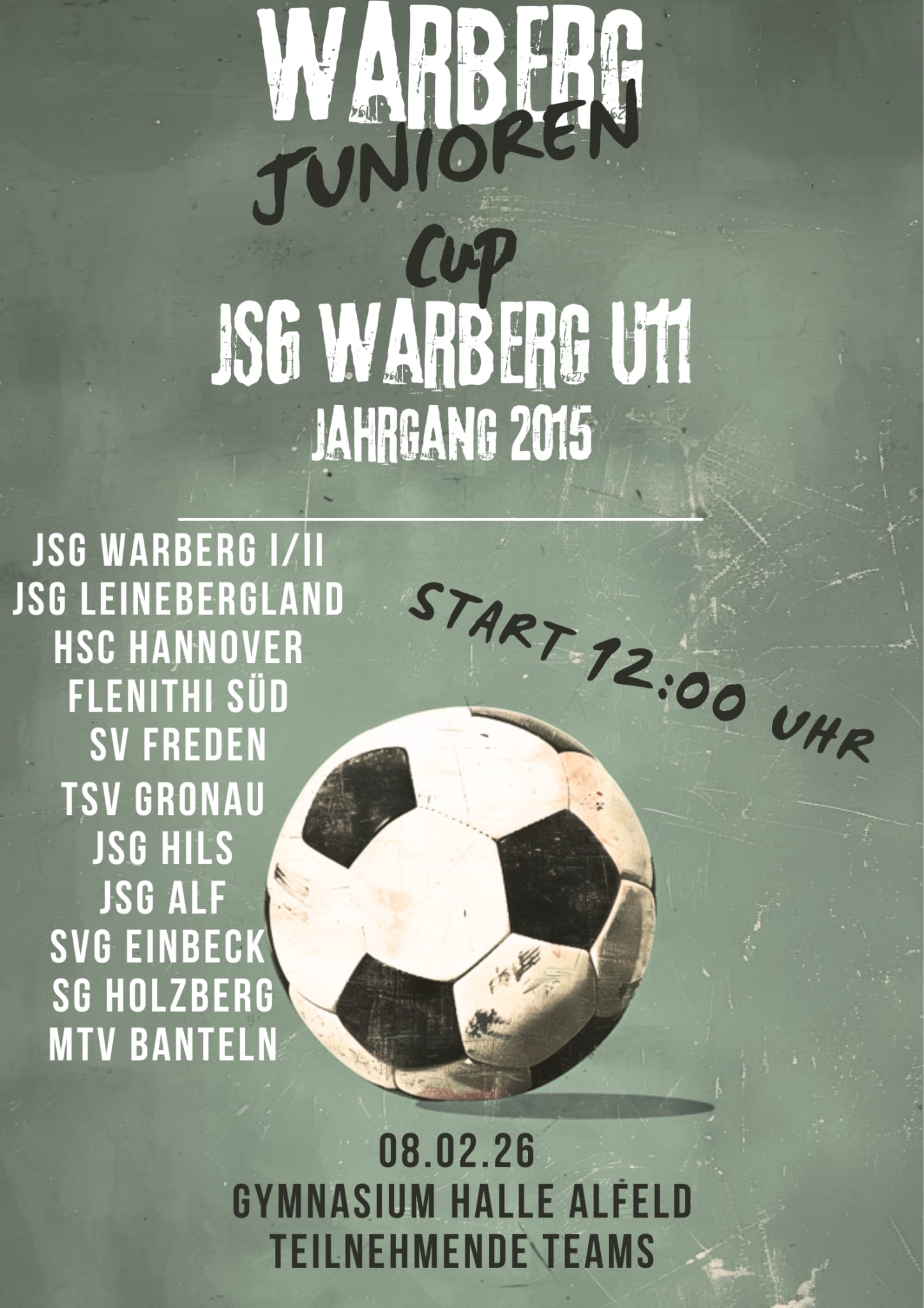 Am 08. Februar 2026 ist es wieder soweit: Der WARBERG JUNIOREN CUP lädt alle Fußballbegeisterten zum großen Turnier in die Sporthalle des Gymnasiums Alfeld ein. Ab 12:00 Uhr rollt der Ball, und die jungen Talente des Jahrgangs 2015 zeigen ihr Können.